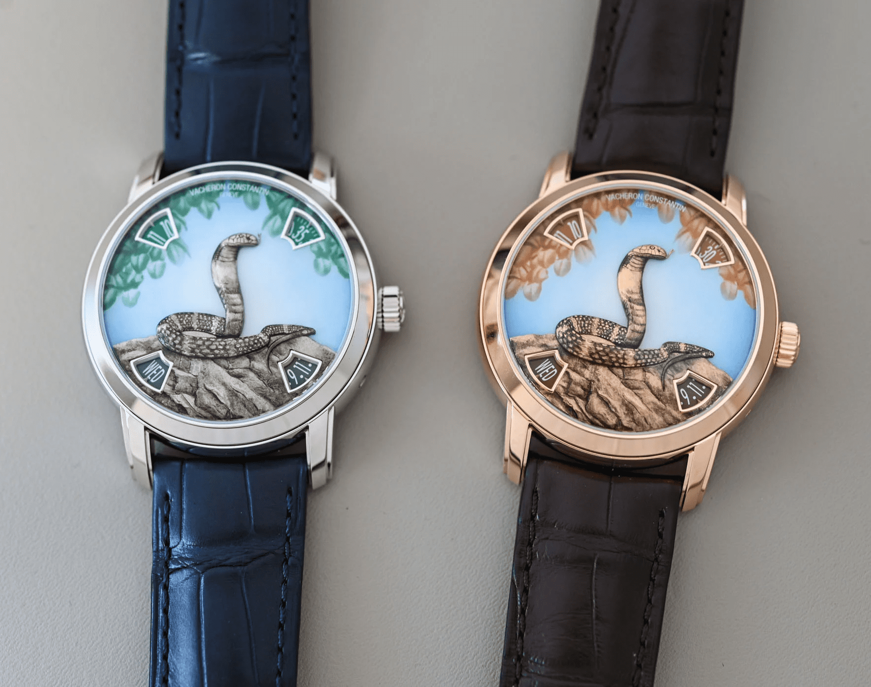 Each timepiece in this limited-edition collection measures 40mm and is offered in two luxurious metals: pink gold or platinum. Both versions feature an exquisite hand-engraved snake motif against a striking Grand Feu enamel dial. The platinum model showcases a deep blue dial, while the pink gold version has a warm, rich brown backdrop, making the intricate engraving truly pop. The snake is a symbol of grace, strength, and wisdom, perfectly captured through the brand’s exceptional artistry.